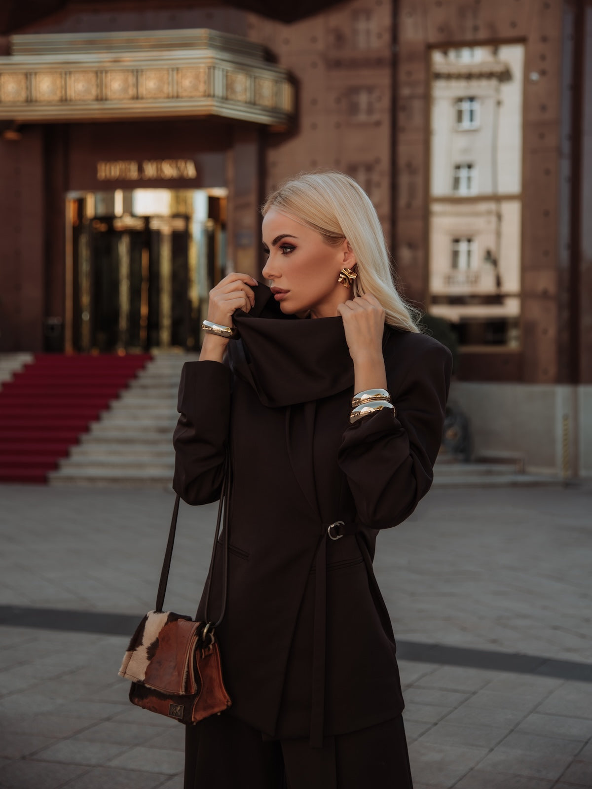 Čokoladno braon odelo od vunenog stofa sa blago dužim sakoom koji se kopča vrpcom i prstenom u struku, uz šal koji se elegantno može prebaciti preko ramena.