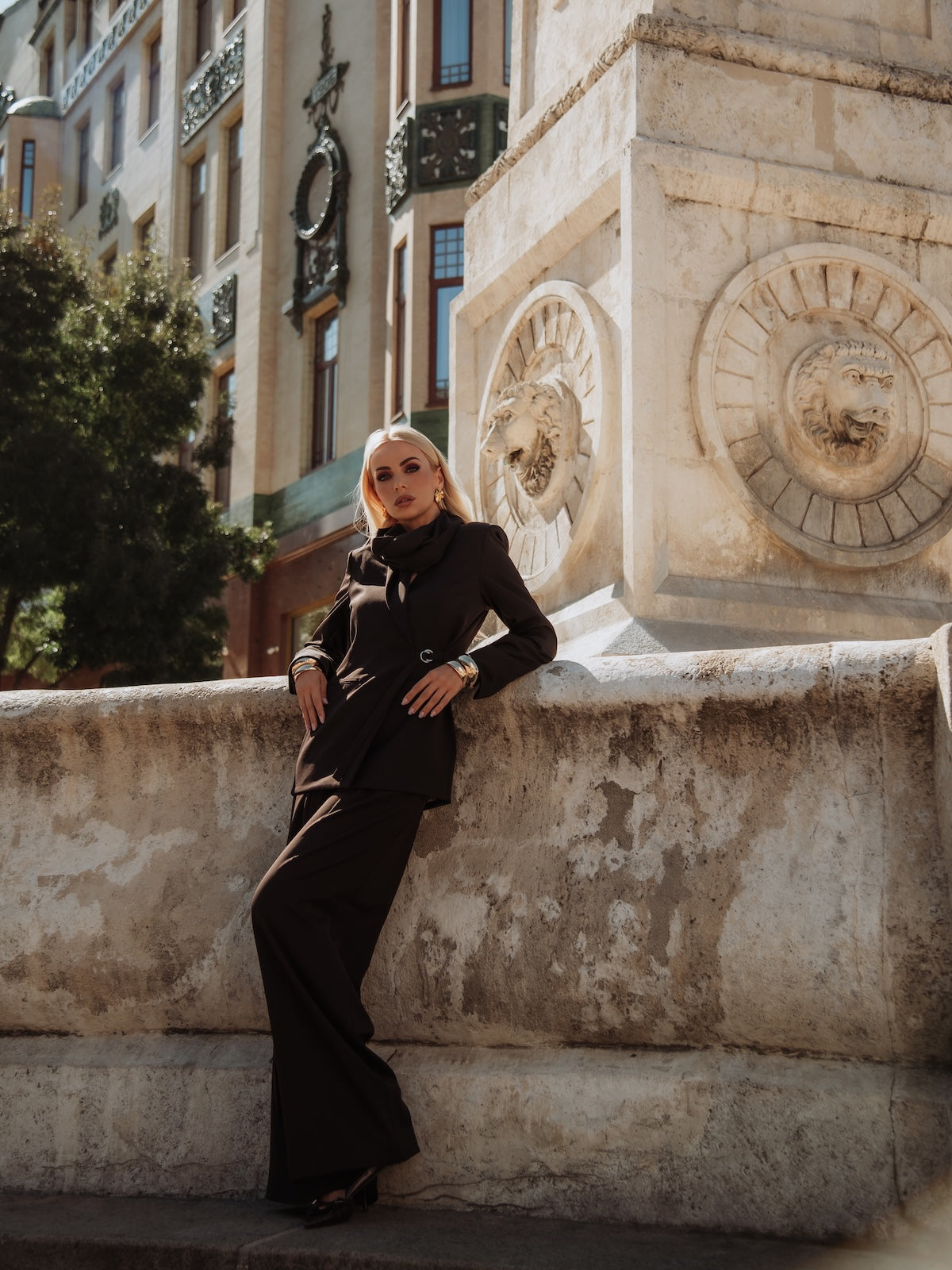 Pantalone visokog struka, diskretno zvonaste, upotpunjuju sofisticiranu siluetu.