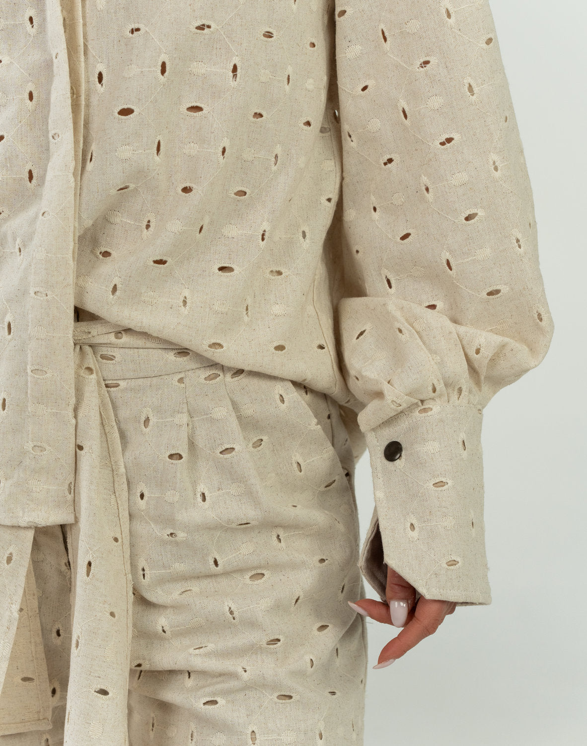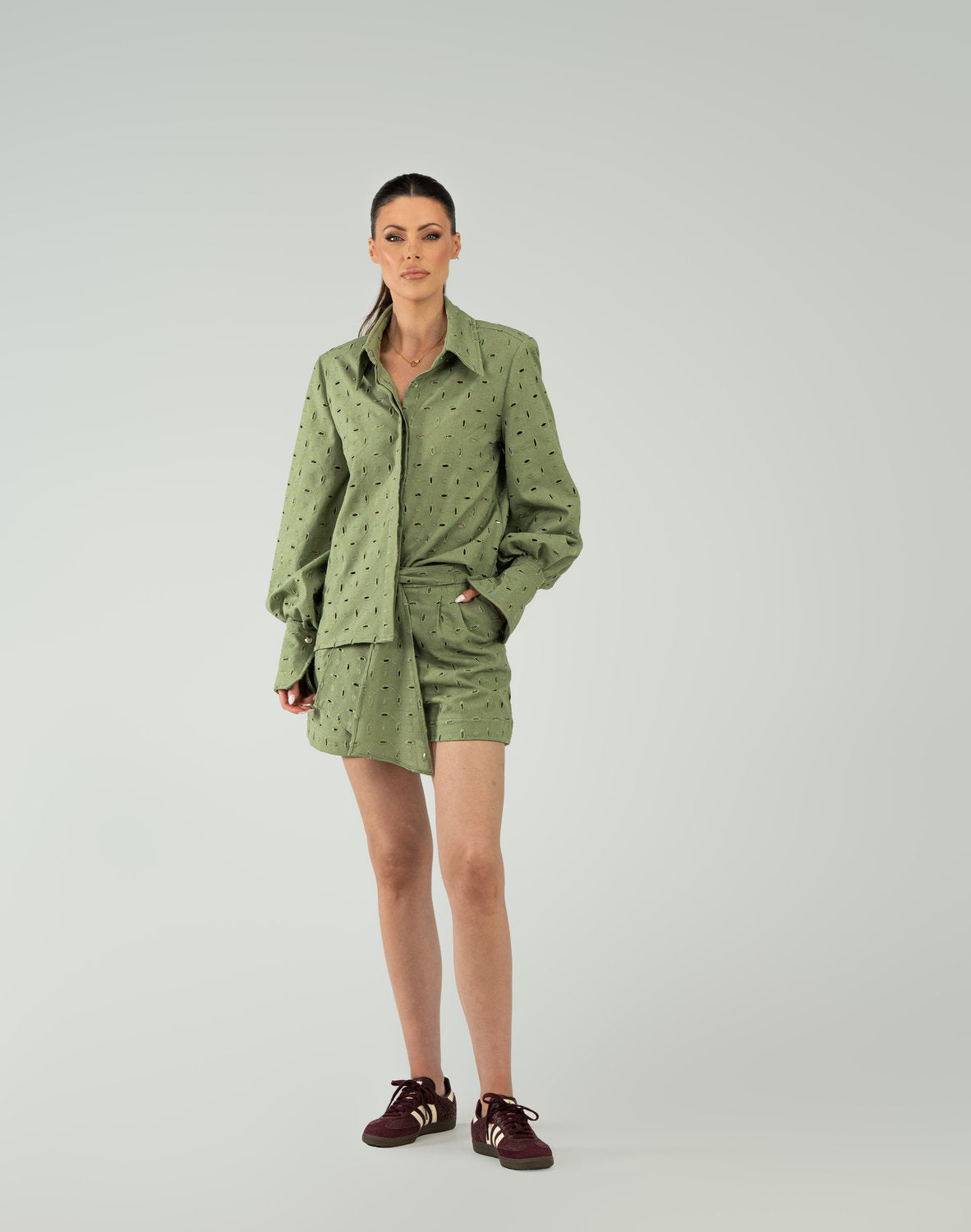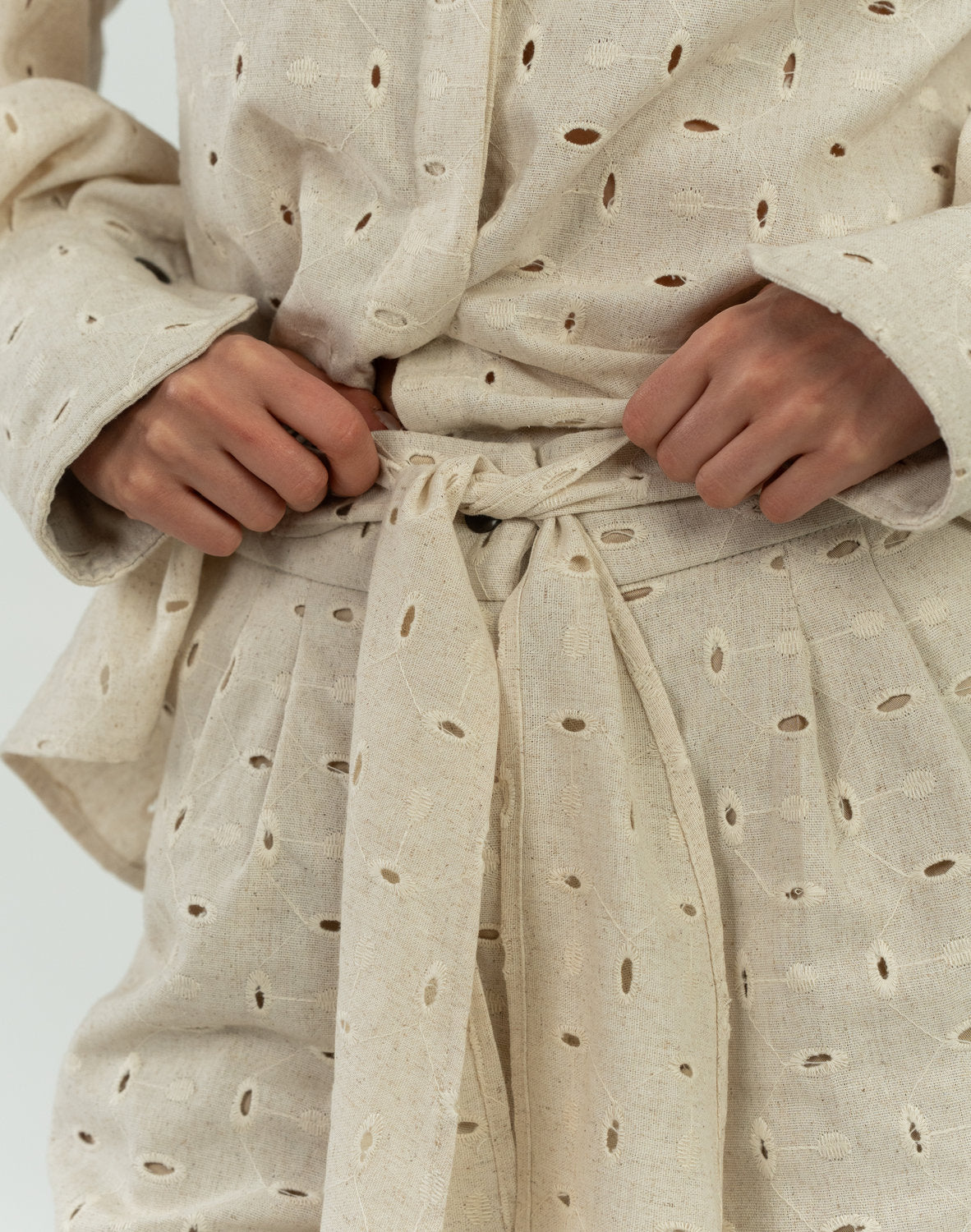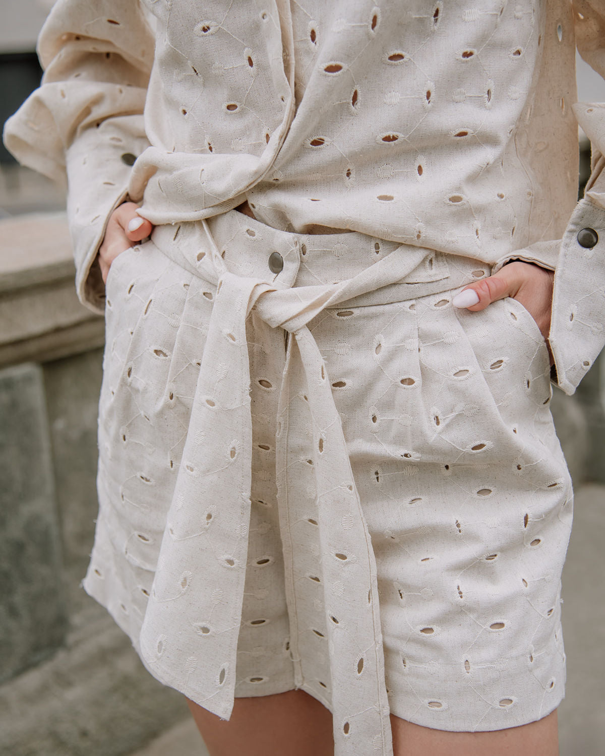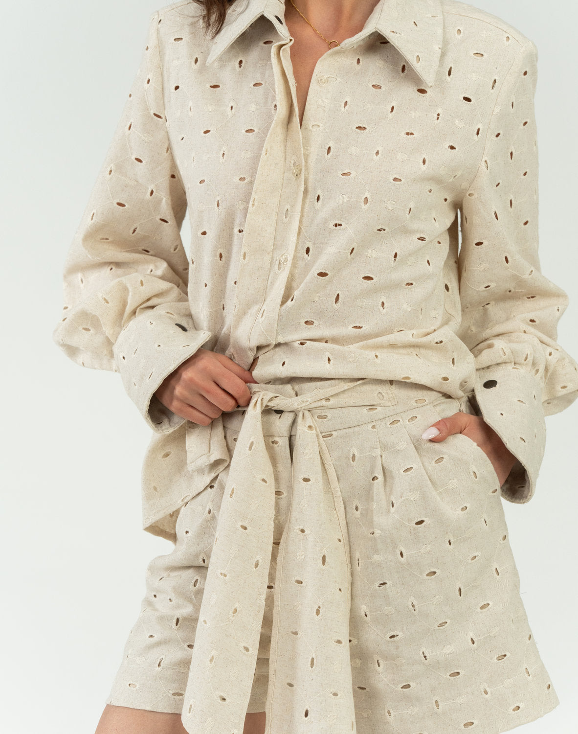 The Tera set is designed for maximum breathability and comfort, crafted from 100% eyelet cotton with a distinct texture. The oversized shirt features wide cuffs, while the high-waisted shorts with a belt accents the silhouette.