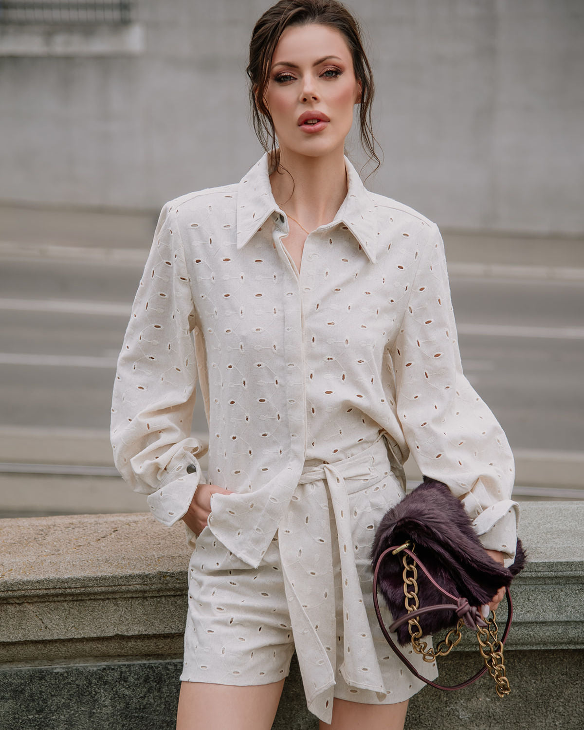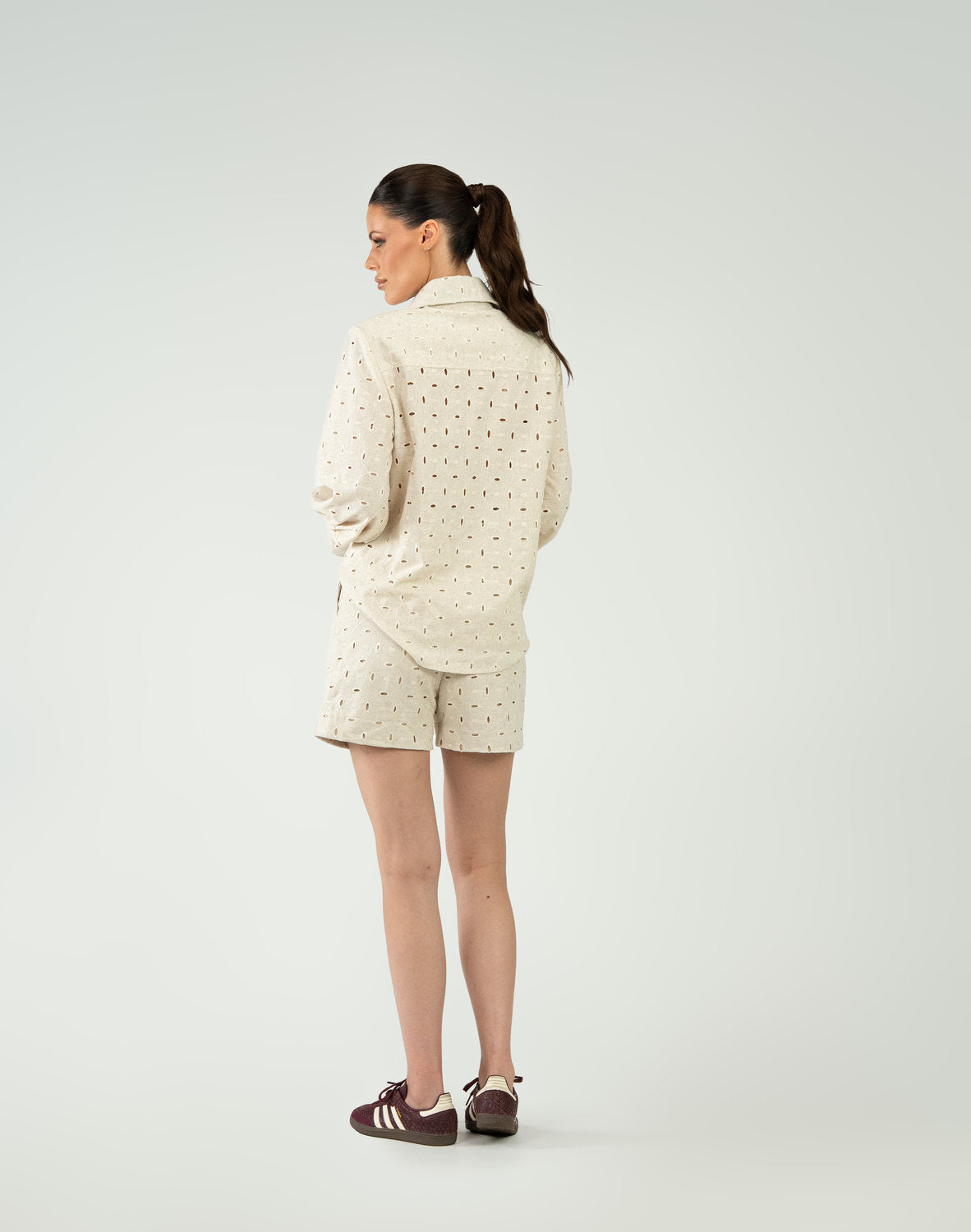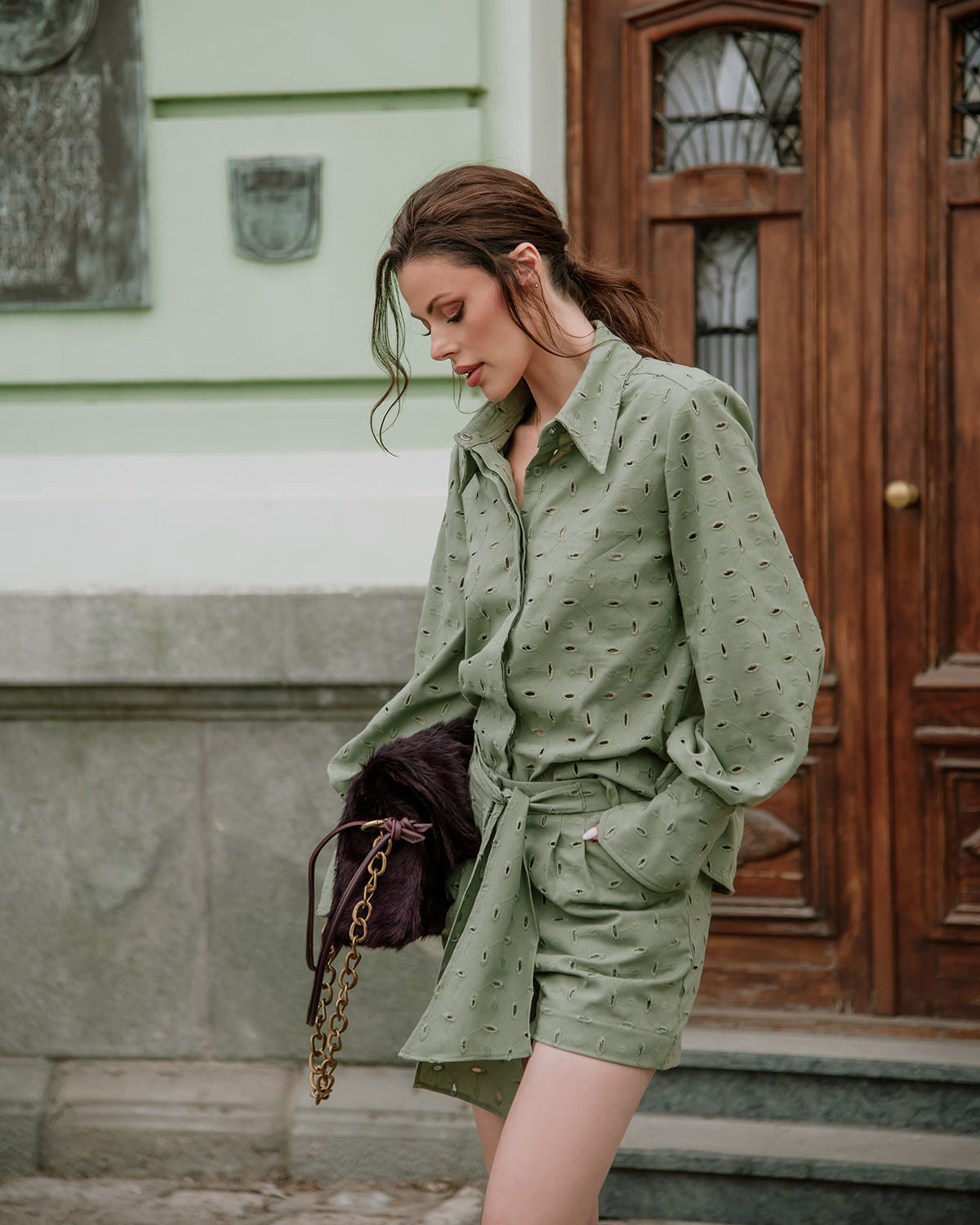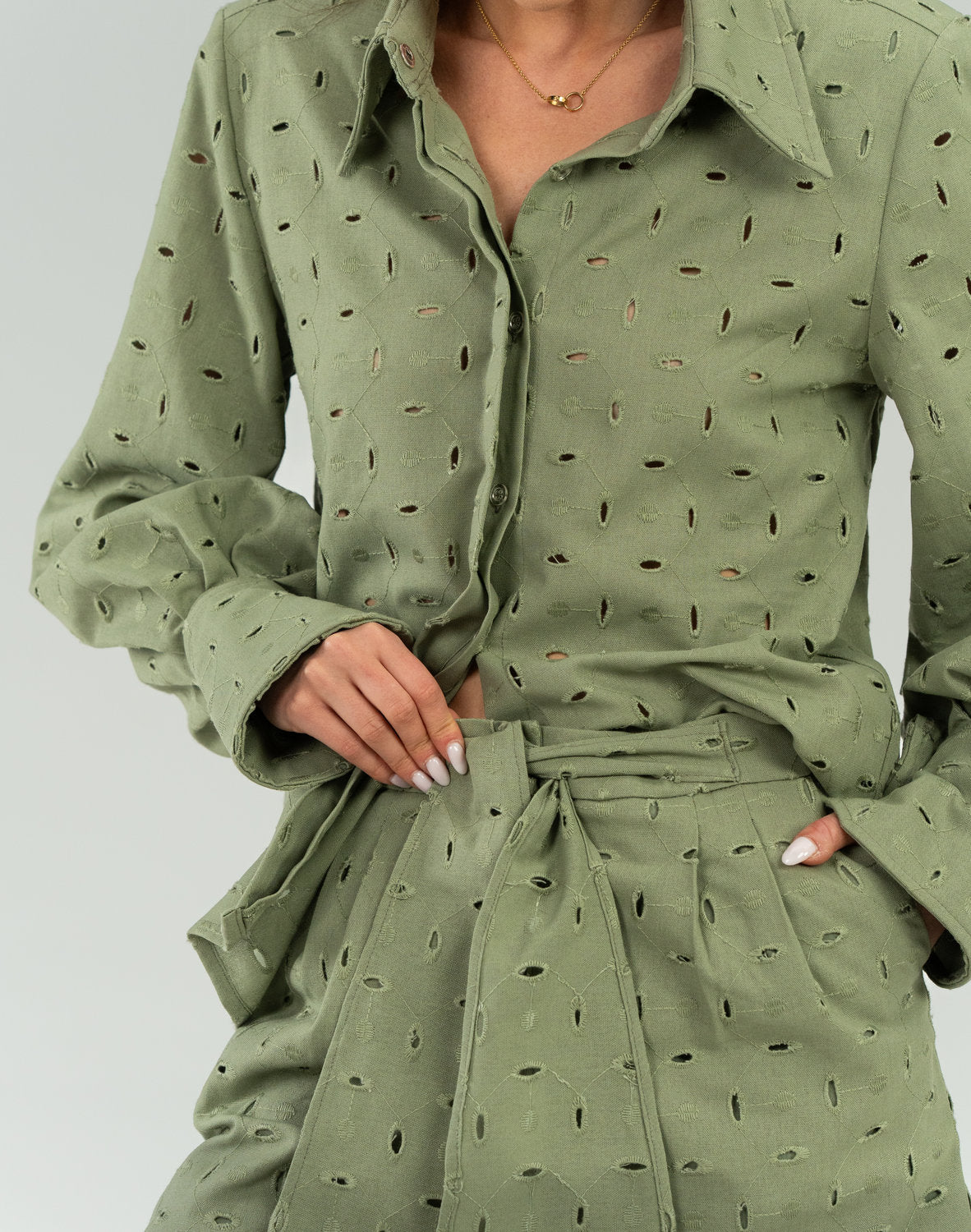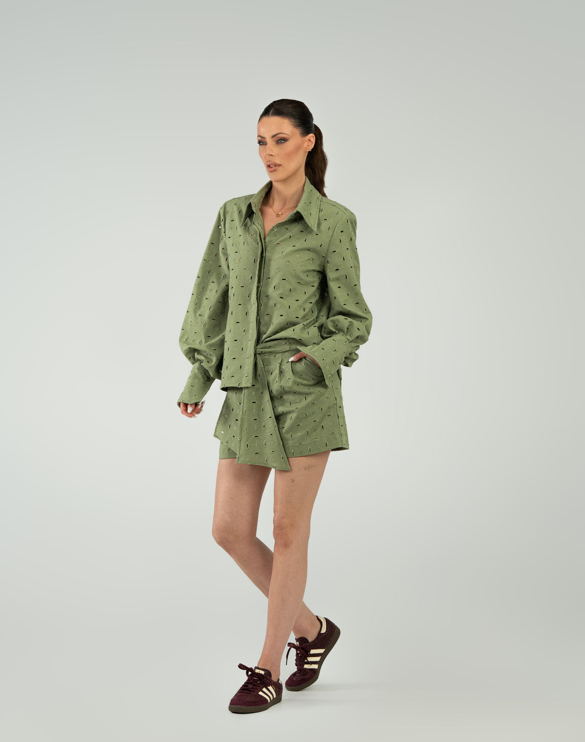 The Tera set is designed for maximum breathability and comfort, crafted from 100% eyelet cotton with a distinct texture. The oversized shirt features wide cuffs, while the high-waisted shorts with a belt accents the silhouette.