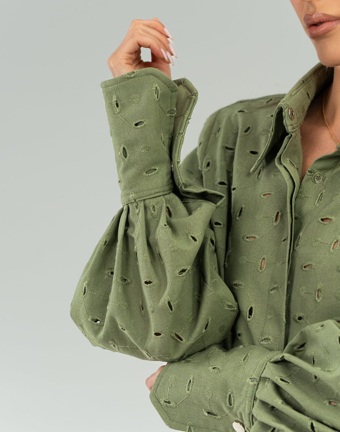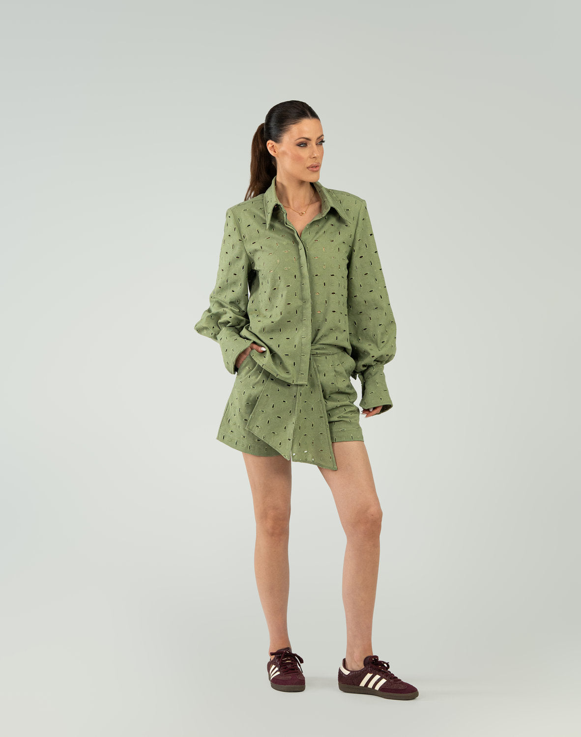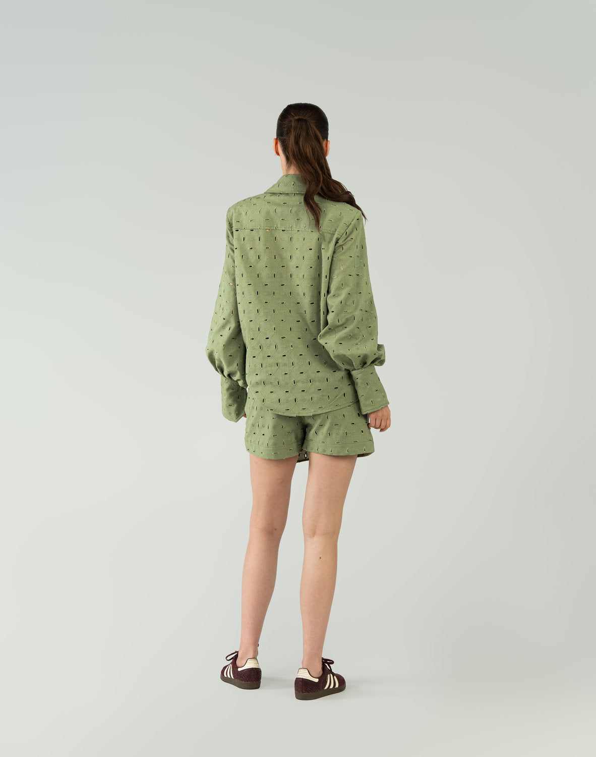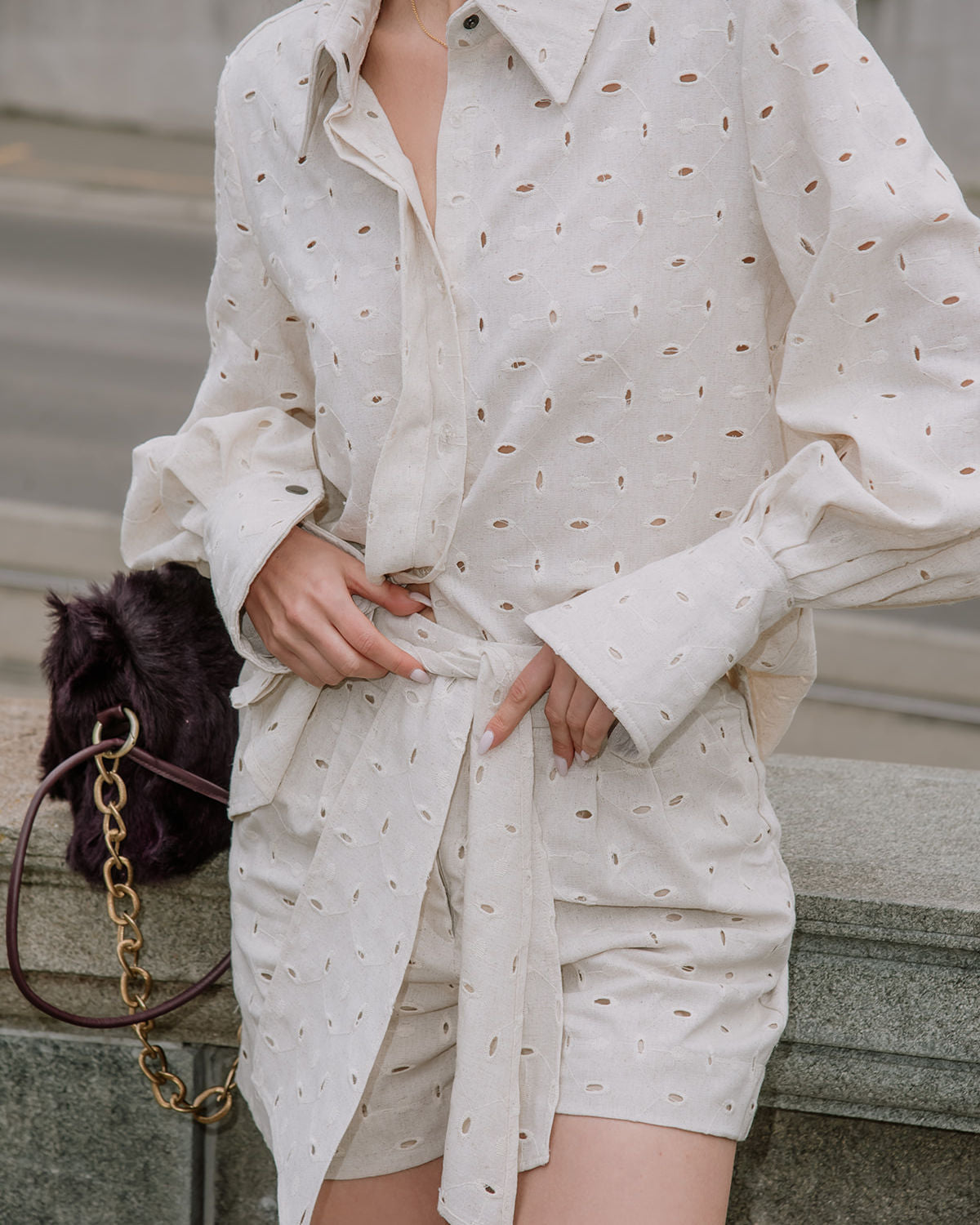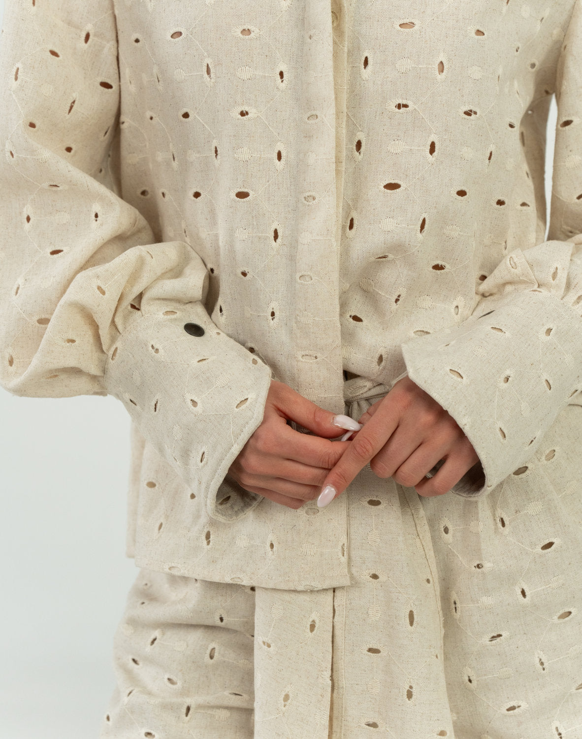 The Tera set is designed for maximum breathability and comfort, crafted from 100% eyelet cotton with a distinct texture. The oversized shirt features wide cuffs, while the high-waisted shorts with a belt accents the silhouette.