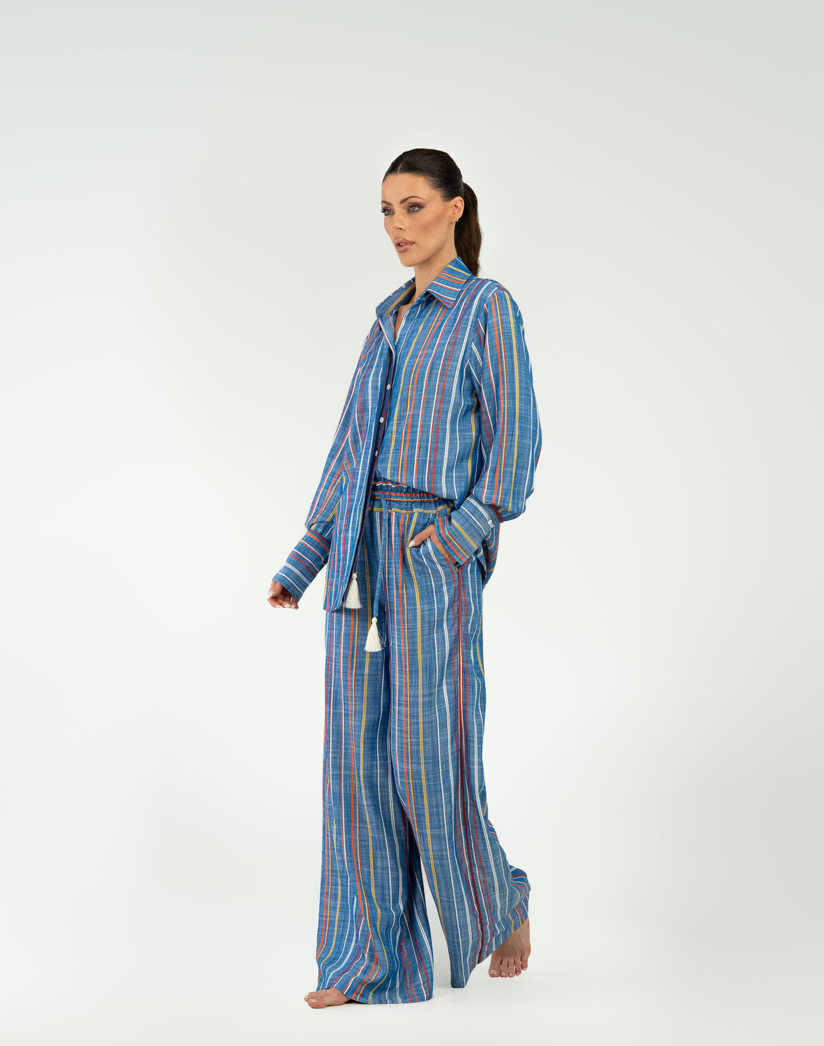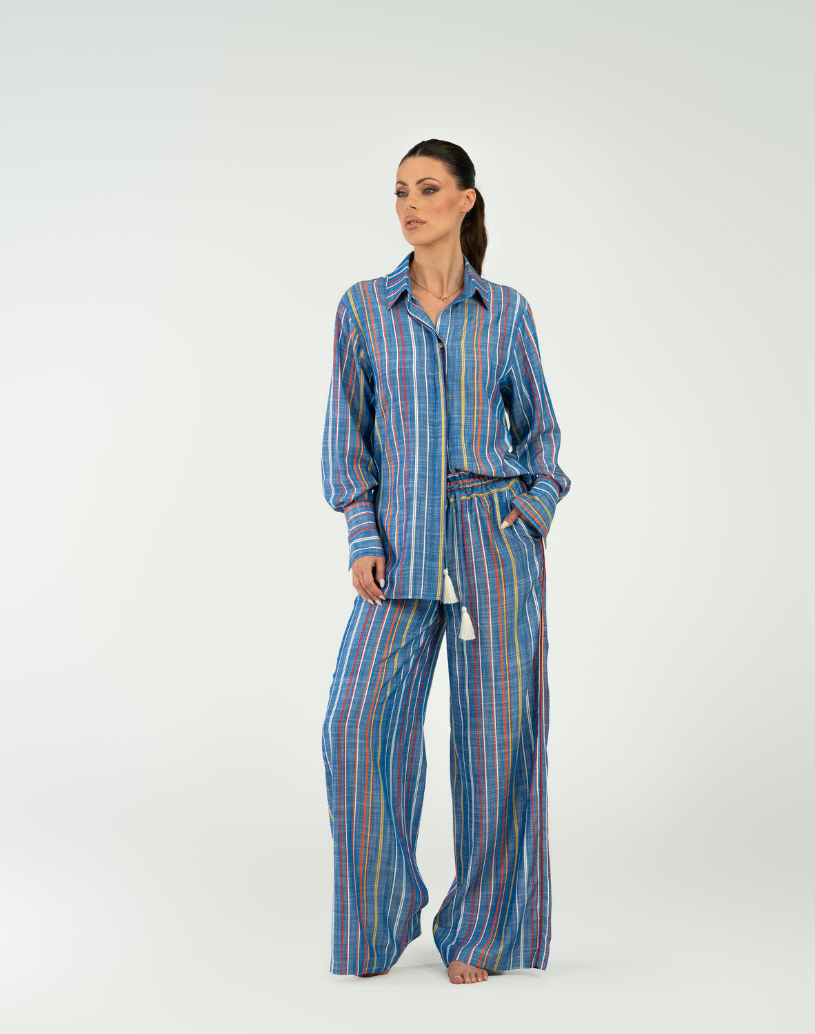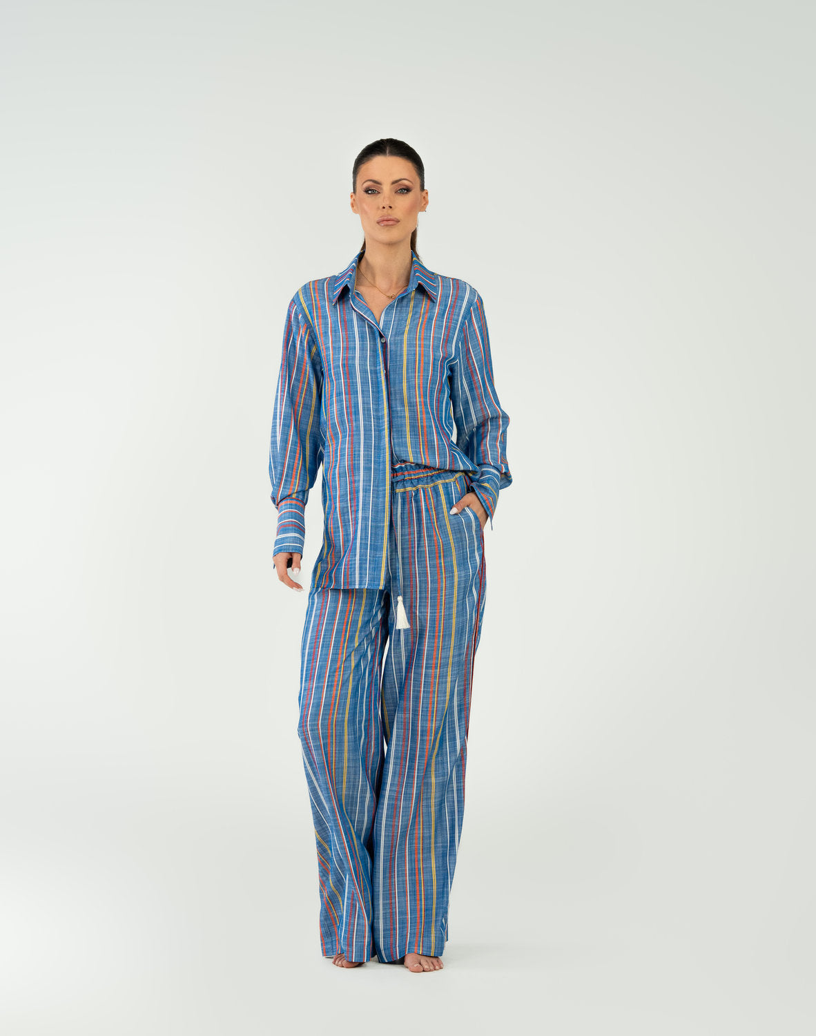 The Iskra pajama set brings a new wave of energy to your downtime through a dynamic blend of color and natural fabrics. Crafted from 100% viscose, this pajama set offers exceptional comfort and breathability, allowing your skin to breathe freely throughout the night. The sky blue base with vibrant orange and yellow stripes celebrates movement and vitality, while the oversized shirt with structured cuffs and wide-leg trousers, accented by decorative white tassels, create a luxurious yet completely natural look. An ideal choice for relaxed mornings where comfort and a striking aesthetic come first.