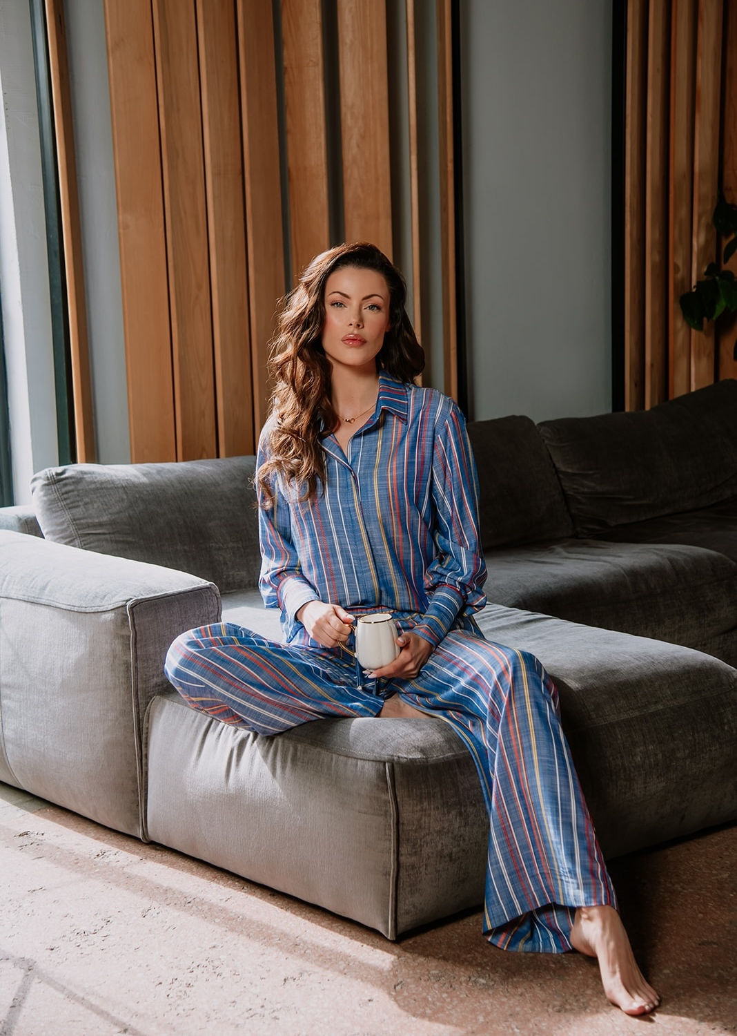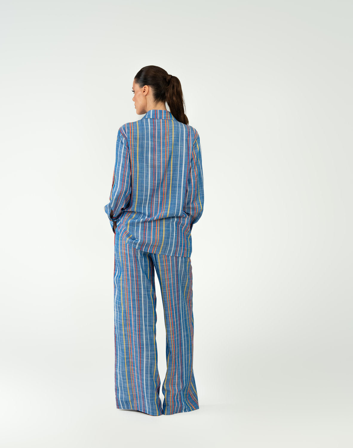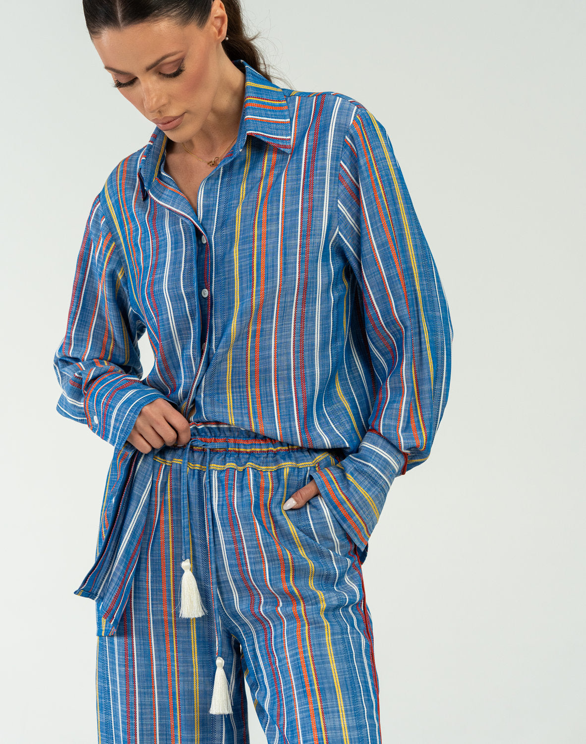 The Iskra pajama set brings a new wave of energy to your downtime through a dynamic blend of color and natural fabrics. Crafted from 100% viscose, this pajama set offers exceptional comfort and breathability, allowing your skin to breathe freely throughout the night. The sky blue base with vibrant orange and yellow stripes celebrates movement and vitality, while the oversized shirt with structured cuffs and wide-leg trousers, accented by decorative white tassels, create a luxurious yet completely natural look. An ideal choice for relaxed mornings where comfort and a striking aesthetic come first.