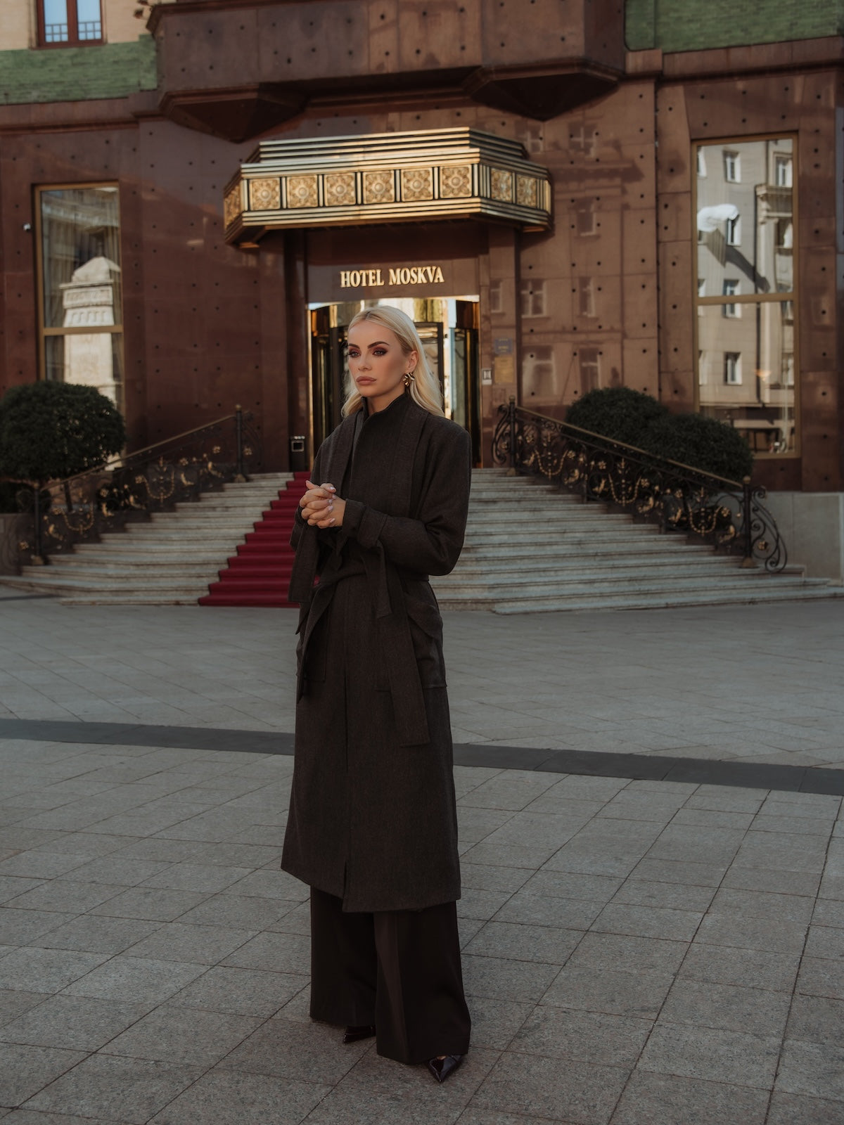 This warm beige wool coat with viscose lining offers a refined look with practical details. Long sleeves, complemented by adjustable straps and unique pockets add functional charm. The coat features additional straps around the neck and waist, enhancing its simple yet sophisticated design.