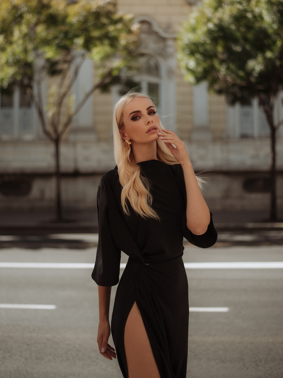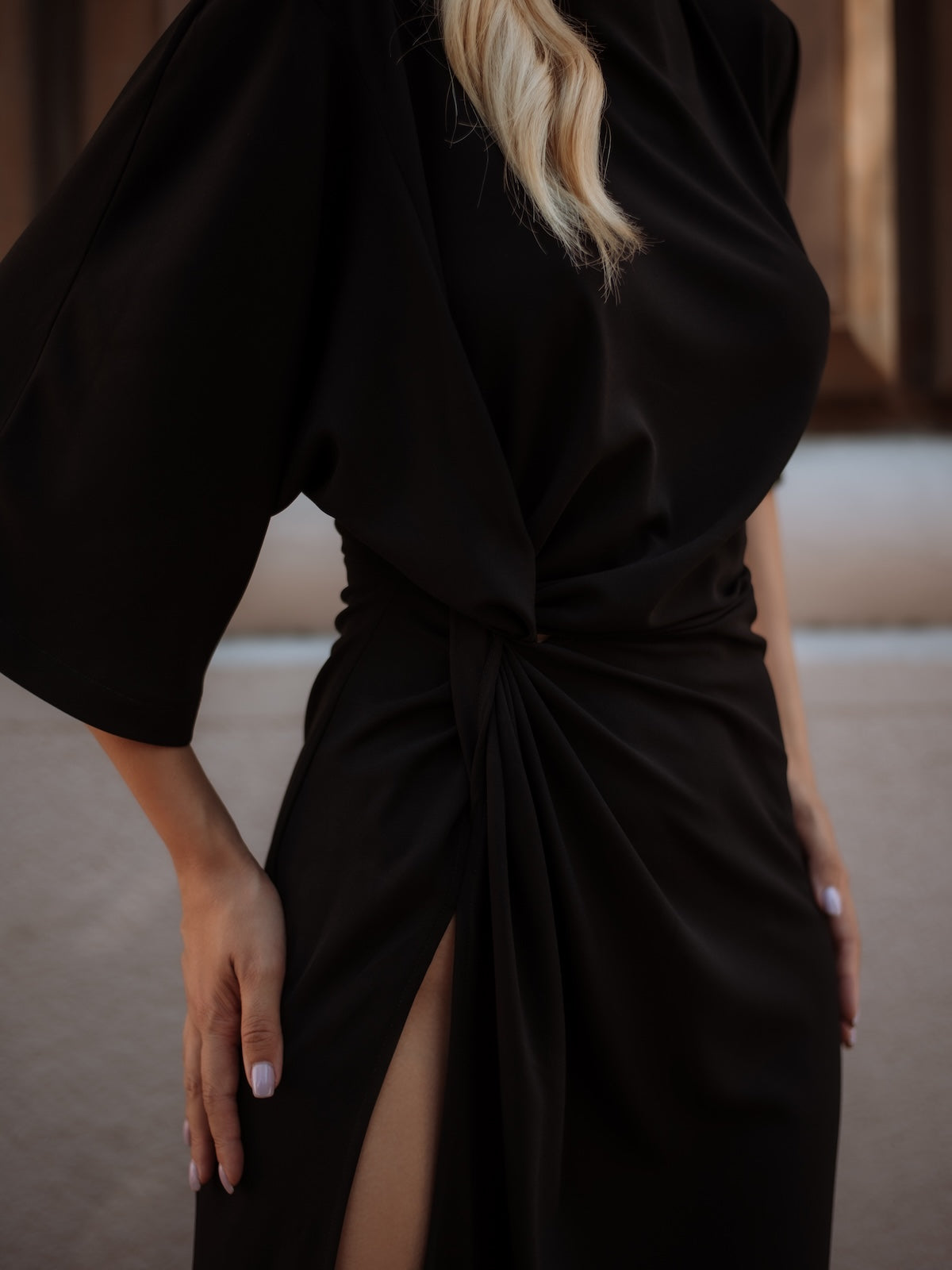 A refined georgette gown with a subtle stand collar and elegantly flared sleeves falling to mid-arm. A knot detail cinches the waist, enhancing the silhouette, while a high slit adds a touch of allure. Timeless and striking — a perfect choice for evening occasions.